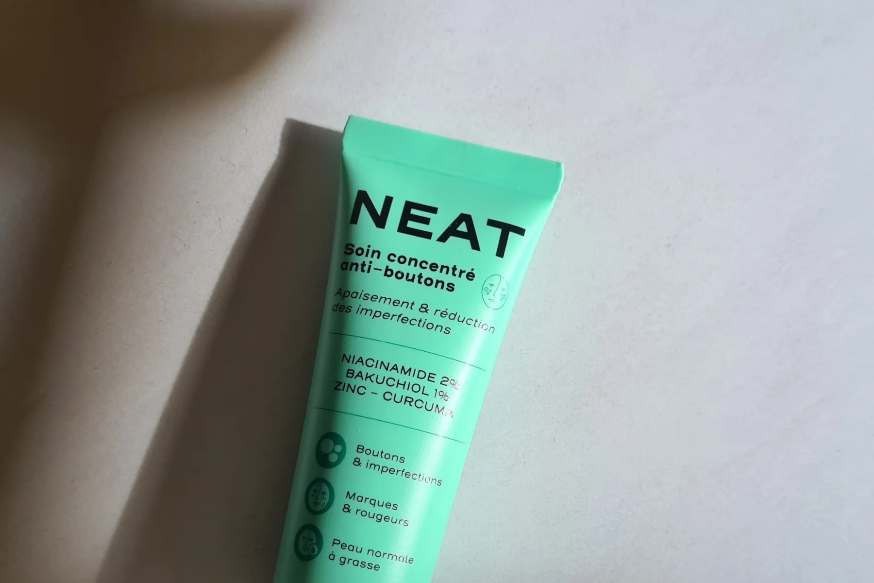 Le soin Neat convient à toutes les peaux, mais il ne faut pas hésiter à checker la formule pour voir s’il n’y a pas un ingrédient auquel vous êtes allergique (histoire de pas avoir de très mauvaises surprises).